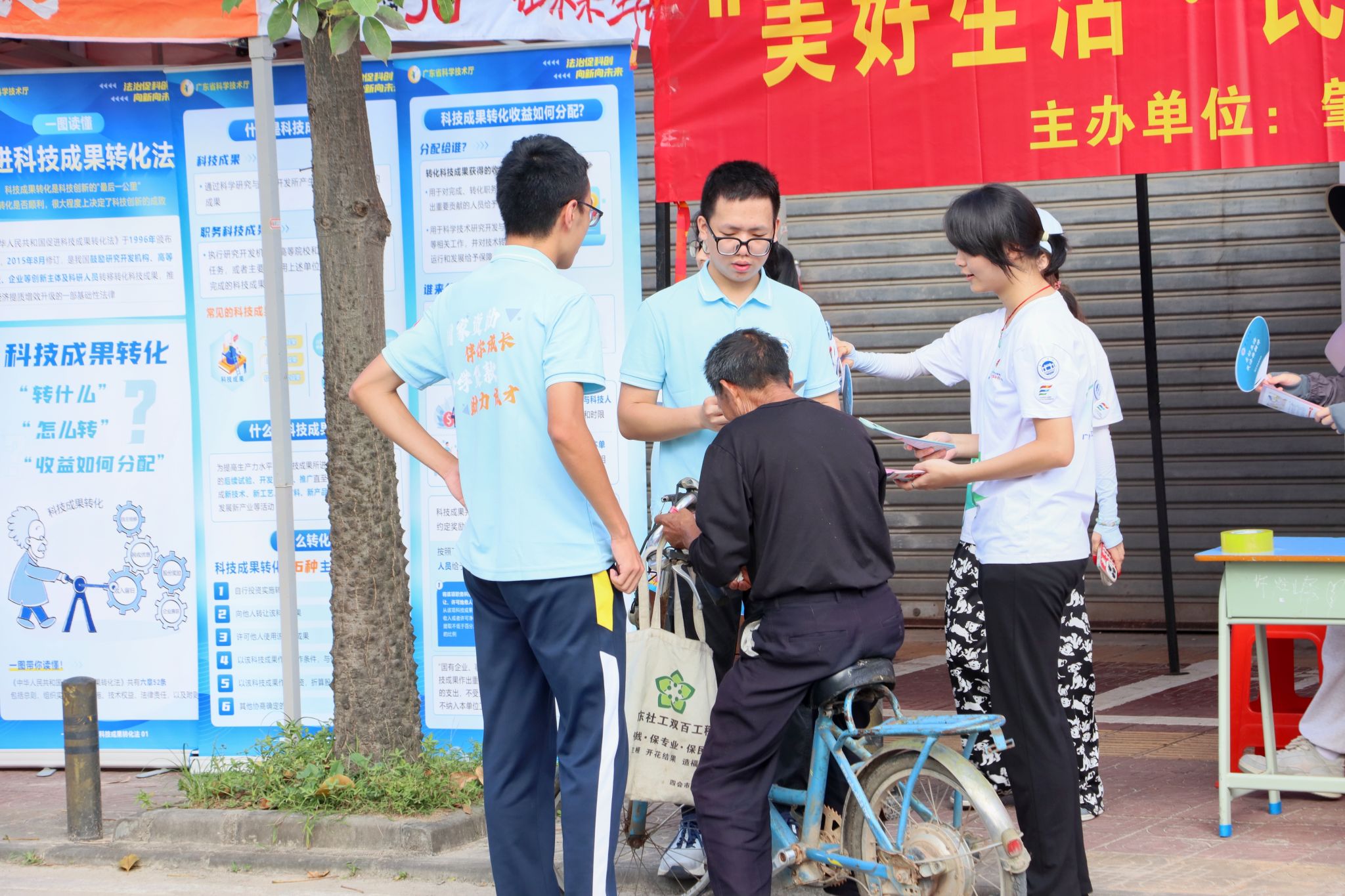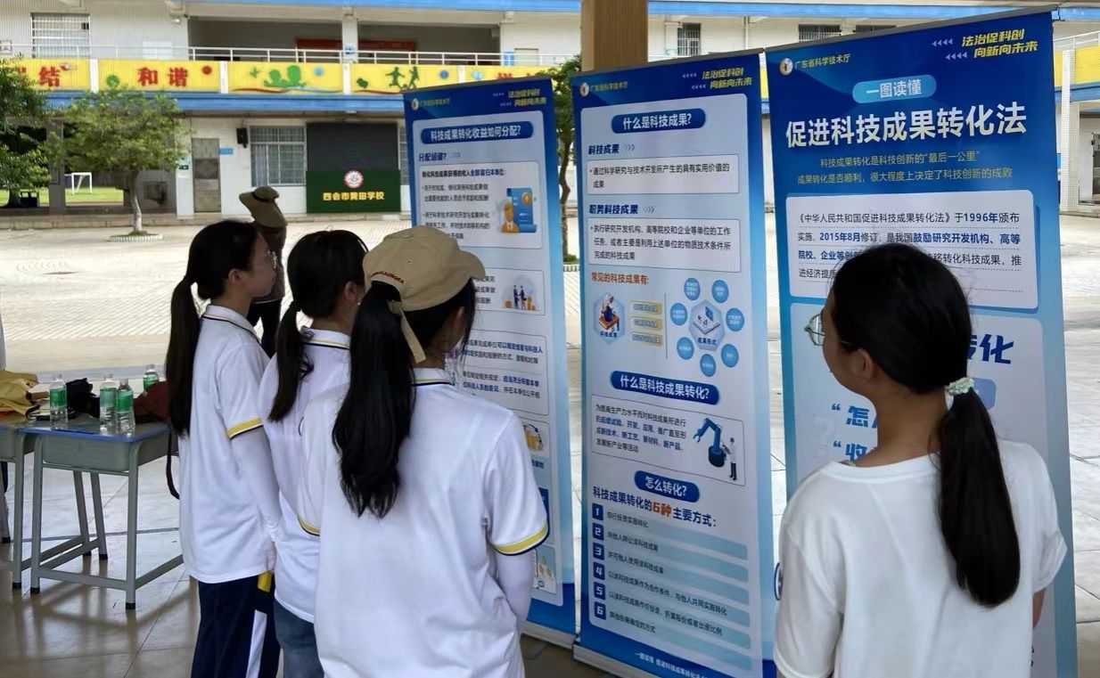 青年普法志愿者们在四会市大沙镇岗美村,与岗美村村民共同观看了《法在你身边》普法视频,以鲜活的案例向村民传递法律知识;在广东华昌新型铝材有限公司和肇庆市强瑞铝型材制品有限公司,与企业相关负责人面对面交流,现场讲解科技法律法规知识,并强调科技创新与法律支持相结合的重要性;在四会市黄田镇街道设立专门的普法摊位,并摆放了普法展板,向前来赶集的村民发放传单,耐心讲解民法典法律条文和科技法律知识;在广宁江屯镇水月村,与水月村村民通过座谈讲解的方式,用通俗易懂的语言,为村民普及基础的法律知识。