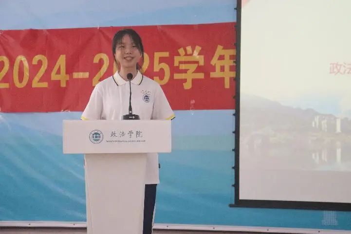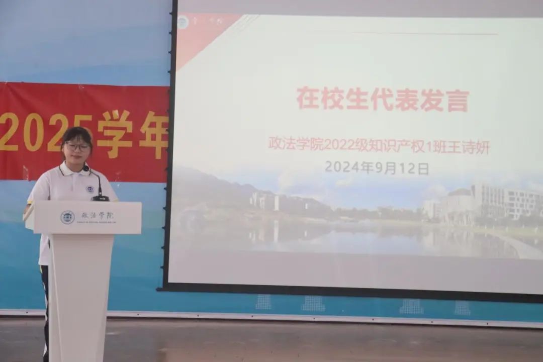 王诗妍同学以“过来人”的经验,向新生们提出了三方面的建议。一、热忱坚守,定力致远。二、全面提升,自我超越。三、自我掌舵,勇担责任。她说到,各位新生们虽刚踏入砚园,离开家长,但要相信接下来的路可以自己走,更可以走得坚定而踏实、勇敢而精彩。
