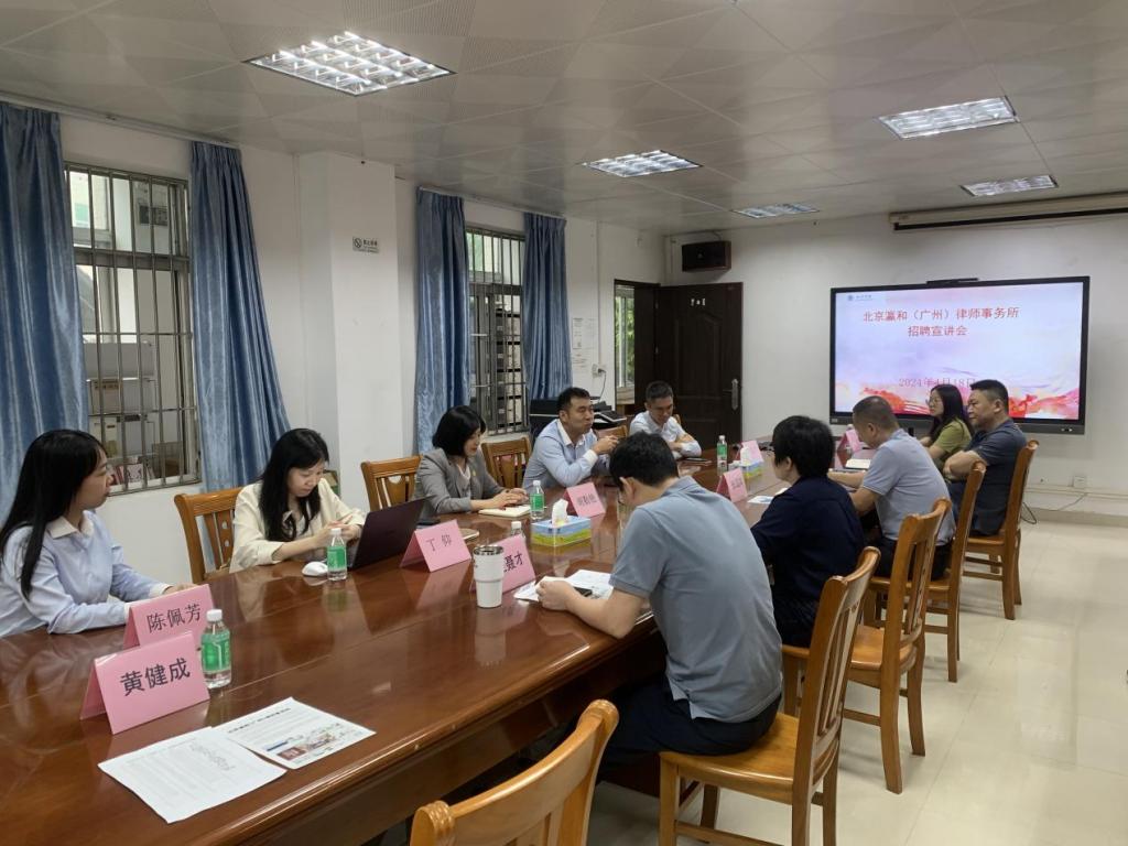 为推动公司2024届毕业生高质量就业,4月18日,公司邀请北京瀛和(广州)律师事务所、广东工匠律师事务所一行到访我院,开展招聘宣讲会并洽谈实习实践基地共建事宜。北京瀛和(广州)律师事务所创始合伙人胡勤艳律师,瀛和广州韦冠杰律师,广东工匠律师事务所李进律师、陈佩芳律师,瀛和广州人事部主管丁仰 ,以及公司党政领导、法学专业学生共30余人参加本次活动。