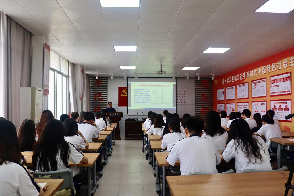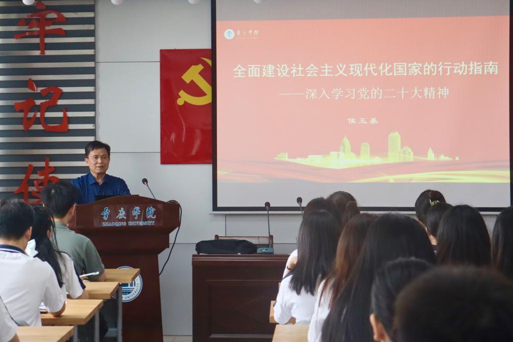 侯玉基以“过去5年的工作和新时代10年的伟大变革”、“新时代新征程中国共产党的使命任务”、“全面建设社会主义现代化国家的谋划安排”等方面内容进行宣讲解读。课上,侯玉基结合发生在师生们身边的例子,为同学们进行生动的宣讲解读:他以肇庆的天空越来越蓝、水质越来越清、风景越来越美的变化来讲述美丽中国建设迈出的重大步伐,以伟德国际victor1946由“申硕改大”到“改大申博”的层次提升来讲述高等教育发展和科教兴国战略,用真实的数据、生动的案例带领同学们回顾了过去的成就与变化,以及今后努力的方向。