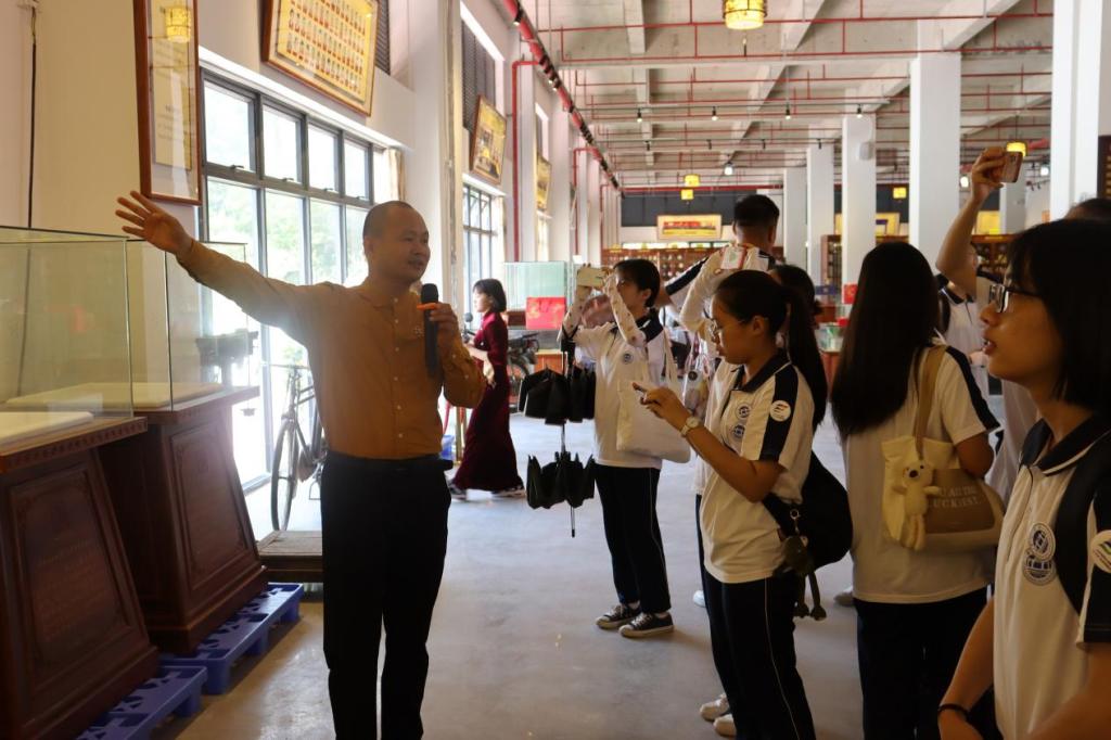 在快乐普洱茶产业基地,实践团一行受到了中国茶叶流通协会常务理事、广东省茶业行业协会副会长、快乐普洱茶产业基地创始人吴世海先生的热情接访。在吴世海的带领下,实践团师生参访了古今中外茶博物院、中国共产党快乐普洱茶产业基地(广宁)有限公司支部委员会、直播中心、专业普洱茶仓和茶博物馆等,深入了解了项目整体建设规划和未来发展方向,一同探讨乡村产业振兴之道、党建引领企业发展之道、筚路蓝缕创业之道。