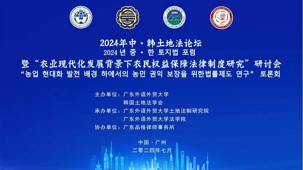 7月20日,2024年中·韩土地法论坛暨“农业现代化发展背景下农民权益保障法律制度研究”研讨会在广东外语外贸大学北校区成功举办。本次会议由广东外语外贸大学、韩国土地法学会主办,广东外语外贸大学土地法制研究院、法公司承办,广东品格律师事务所协办。来自韩国土地法学会、庆熙大学、弘益大学、明知大学、国立江陵原州大学、东亚大学、釜山大学,中国西南政法大学、中南财经政法大学、广州大学、大连海事大学、伟德国际victor1946、广东技术师范公司等省内外高校、科研机构的学者、在校生,以及地方立法机关、律师事务所的专家、实务人士50余人参加了本次会议。公司许英教授受邀参加会议。