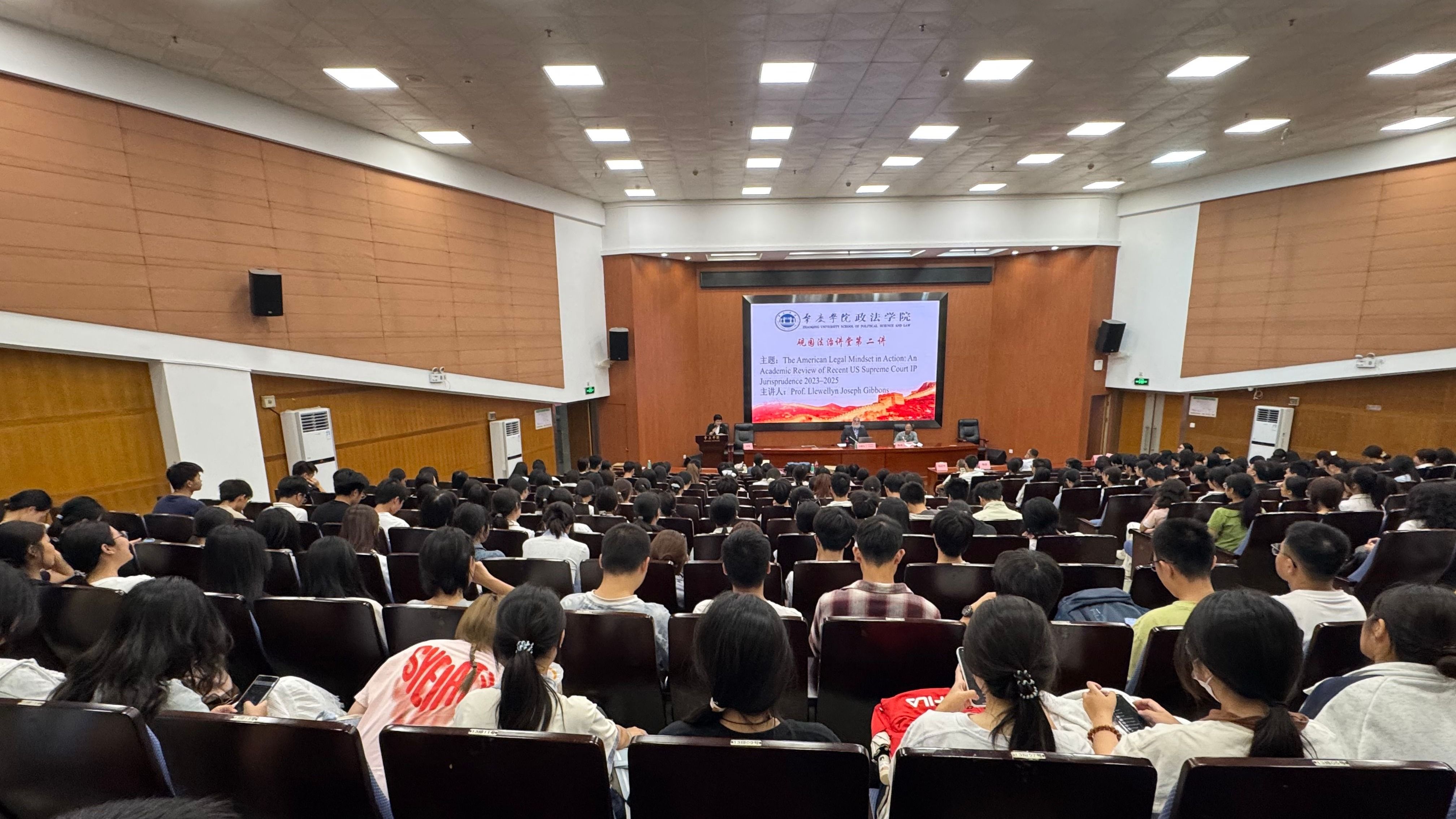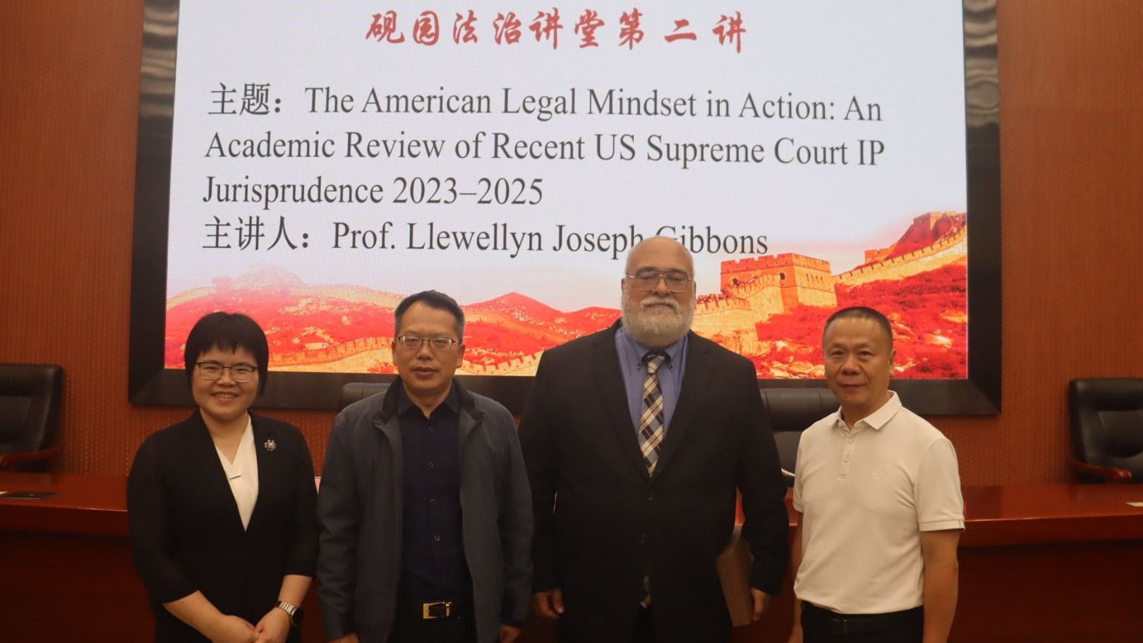 本网讯 为进一步拓宽公司师生国际视野,深化中外学术交流,2025年10月28日晚,由公司主办的“砚园法治讲堂”第二讲在图书馆学术报告厅成功举行。美国托莱多大学法公司杰出教授卢埃林·约瑟夫·吉本斯(Llewellyn Joseph Gibbons)应邀作题为“The American Legal Mindset in Action: An Academic Review of Recent US Supreme Court IP Jurisprudence 2023–2025”的专题讲座。