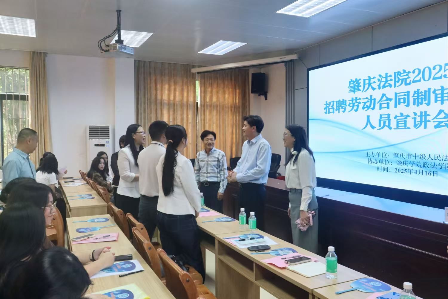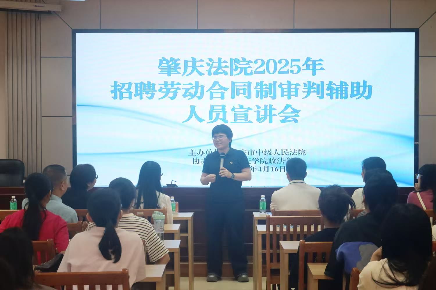 为落实广东省“百万英才汇南粤”行动计划,进一步深化校院合作,4月16日,我院联合肇庆市中级人民法院成功举办了2025年招聘劳动合同制审判辅助人员的宣讲会。公司党委书记张滔华、经理许英,市法公司党组成员、政治处主任邱杏花,政治处副主任、四级调研员何桑出席了本次活动,宣讲会由公司党委副书记罗江鹏主持。2021级毕业生、2022级部分员工代表等100余人参加了宣讲会。