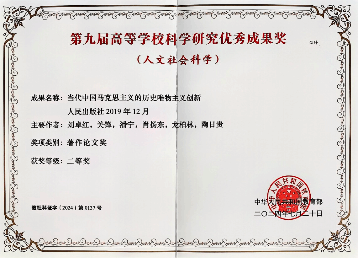在教育部第九届高等公司科学研究优秀成果奖(人文社会科学)获奖成果名单中,公司肖扬东副教授参与合作项目《当代中国马克思主义的历史唯物主义创新》获著作论文奖二等奖。获奖证书 当代中国马克思主义的历史唯物主义创新》一书是国家社科基金重大招标项目“习近平总书记系列重要讲话的历史唯物主义创新研究”(项目号:14ZDA004)的最终研究成果。本书的出版旨在以对习近平新时代中国特色社会主义思想研究为基础,从历史唯物主义及其在当今时代新发展的视角,...